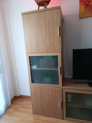 Mueble de comedor de madera con detalles en cristal. Buffett y armario alto de gran capacitat y mesa de 6 personas extensible a 10. Urge por mudanza.
