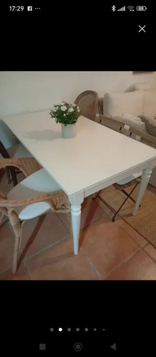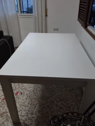 Mesa de comedor de Ikea con un diseño moderno y funcional. Su acabado blanco le da un toque luminoso a cualquier espacio. - Estructura de madera. - Acabado en color blanco. - Extensible de 140cm a 220cm, 74 alto, 84 ancho. En buen estado, pequeños desperfectos en dos patas (ver fotos)