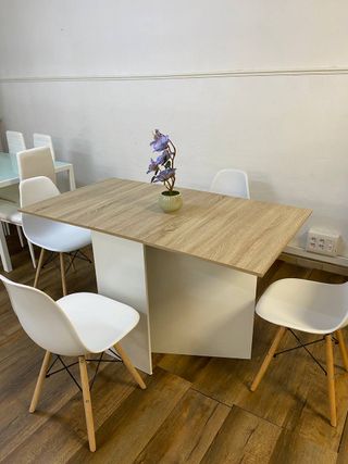 680*558*196 ☎️ Mesa: 75€ Mesa 4 sillas: 131€ Mesa de comedor nueva a estrenar, moderna y funcional, en acabado madera roble claro. Perfecta para hogares que necesitan ahorrar espacio sin renunciar a estilo. Es extensible, por lo que puedes usarla cerrada para el día a día o abrirla para recibir a invitados. Muy estable y de excelente calidad. 📏 Medidas: Largo: 67cm (cerrado) y 134 cm (abierto) Ancho: 67 cm Alto: 78 cm