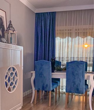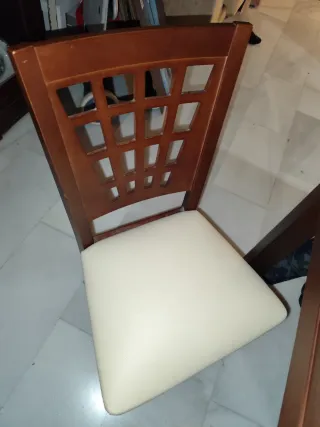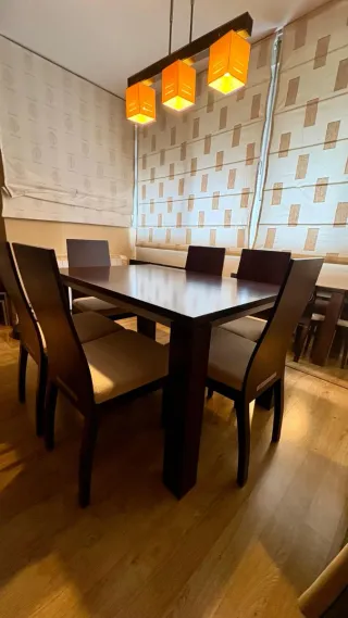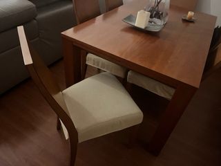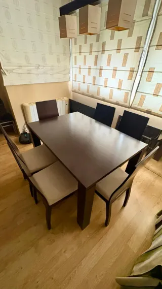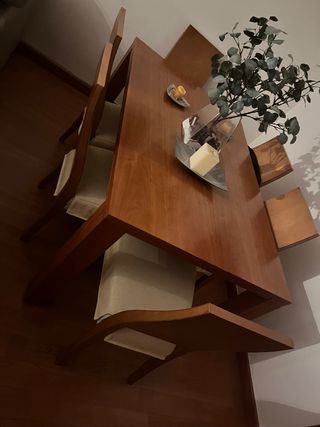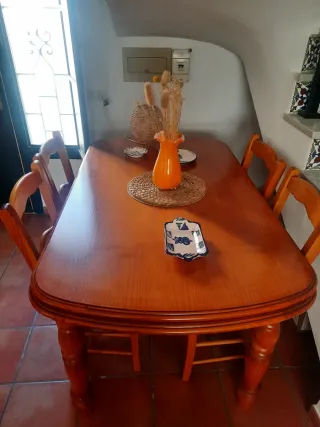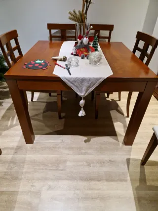 Conjunto de mesa de comedor con cuatro sillas. Vendo mesa de comedor de madera extensible (incluye la tabla adicional para alargarla) y cuatro sillas tapizadas en terciopelo. El conjunto casi no se ha utilizado, solo en la cena de Navidad. Las sillas están en estado muy bueno : • Una silla tiene un pequeño daño en la parte superior causado por las uñas de mi gato. • Otras dos tienen marcas mínimas, prácticamente invisibles. La mesa y las sillas están en muy, muy buen estado, listas para usar. Perfecto para un comedor elegante y acogedor.k