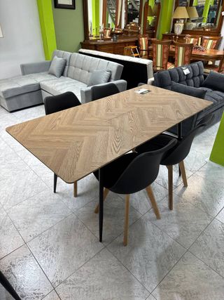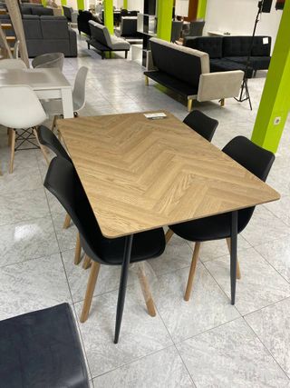 Llama ya! 📞24/7 📍 632*24*70*00 📞 📦 ENVIOS A TODA ESPAÑA 🌍 🛋️ MUEBLES NUEVOS DE TODO TIPO PARA EL HOGAR 🏠 🎁 NUEVOS EN SU CAJA DE FABRICA 📦 🔒 CON GARANTÍA DE FABRICA DE 2 AÑOS 🔒 1️⃣ Se suben hasta el domicilio 🚚🏠 2️⃣ El pago es en persona al recibir 💵📲 3️⃣ Pago en efectivo 💸 Conjunto de mesa de comedor con un diseño moderno y cuatro sillas. - Mesa con tablero de madera con patrón de espiga. - Patas de la mesa de metal negro. - Sillas de diseño ergonómico en color negro.