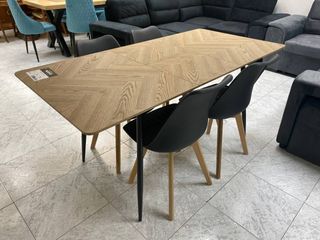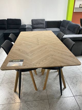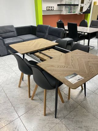 Llama ya! 📞24/7 📍 632*24*70*00 📞 📦 ENVIOS A TODA ESPAÑA 🌍 🛋️ MUEBLES NUEVOS DE TODO TIPO PARA EL HOGAR 🏠 🎁 NUEVOS EN SU CAJA DE FABRICA 📦 🔒 CON GARANTÍA DE FABRICA DE 2 AÑOS 🔒 1️⃣ Se suben hasta el domicilio 🚚🏠 2️⃣ El pago es en persona al recibir 💵📲 3️⃣ Pago en efectivo 💸 Conjunto de mesa extensible con un diseño moderno y cuatro sillas de comedor. - Mesa con tablero de madera con acabado espiga. - Patas de la mesa en madera y negro. - Sillas acolchadas con patas de madera.