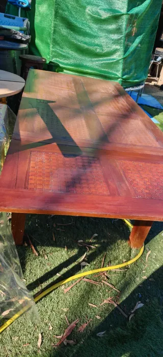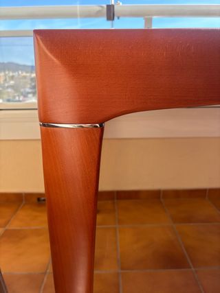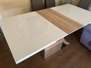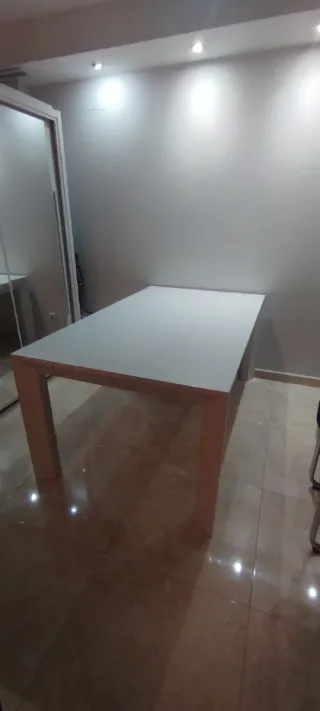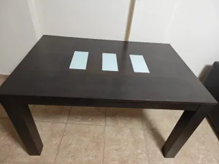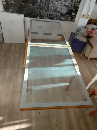 Mesa de comedor extensible. Tiene algunos defectos como se ve en las fotos. Ya la tengo desmontada Cerrada mide 120x90 Abierta mide 240x90 - Tablero de cristal. - Estructura de madera y metal.