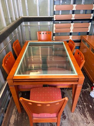 Conjunto de mesa de comedor extensible con seis sillas a juego. Ideal para reuniones familiares o con amigos. Posibilidad de entrega en Málaga - Mesa con sobre de cristal. - Sillas de madera con asiento tapizado.