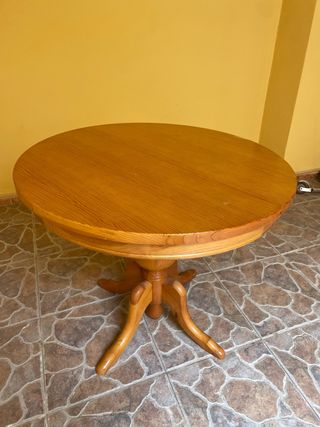 Mesa de madera barnizada. Color miel. 90cms diametro , extensible a 120cms. Tieme un pequeño arañazo en un lateral.