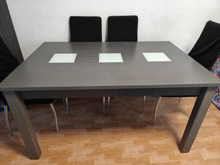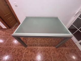 Mesa de comedor extensible de color gris ceniza. Está en buen estado y es perfecta para cualquier hogar. - Extensible para mayor capacidad. - Acabado elegante y moderno. - Lleva 3 cristales en medio. Medidas: 140/180 largo, 90 fondo y 79 de alto. Atención lleva un pequeño rallajito en la mesa y en una de las patas.
