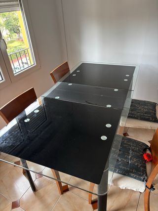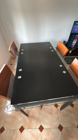 Elegante mesa de comedor extensible con sobre de cristal negro y estructura metálica. La mesa está en buen estado, lista para usar. -Extensible hasta 180cm cojea de una patita pero es 100% funcional sin problema alguno