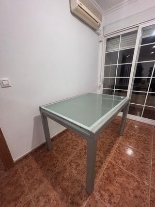 Elegante mesa con sobre de cristal y estructura metálica. es extensible hasta 2,40m