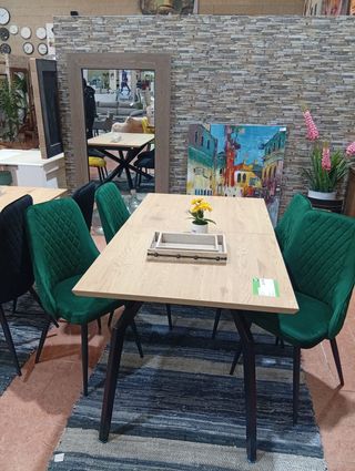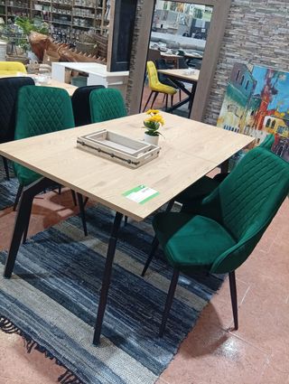 Conjunto de comedor con mesa extensible y cuatro sillas. - Mesa con sobre de madera y patas metálicas. - Sillas tapizadas en terciopelo verde. - Diseño moderno y elegante.