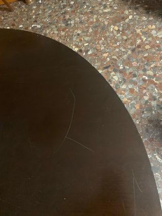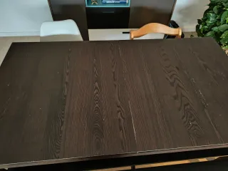 Mesa de comedor de madera maciza en color oscuro, con sistema extensible central. Se abre y cierra con facilidad y ofrece una buena estabilidad gracias a sus patas torneadas. Usada, con marcas visibles de desgaste. Presenta arañazos en la superficie y un golpe en el borde (todo detallado en fotos). Aun así, es totalmente funcional y perfecta para darle un uso diario, segunda vivienda o un proyecto de restauración.