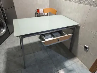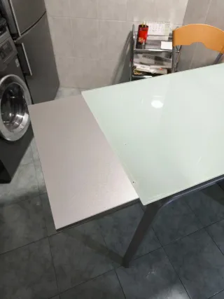 Mesa de cocina con superficie de cristal y estructura metálica. Tiene dos alas extensibles de 25'5cm cada una Tiene unas pequeñas imperfecciones a los lados del cristal por debajo, en el tinte, el cristal está en perfectas condiciones
