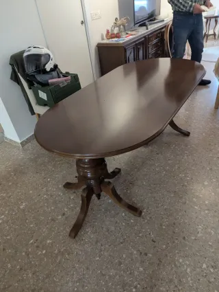 Imponente mesa de madera maciza con tapa de raíz de nogal, extensible hasta 283 cm gracias a dos piezas centrales (45 x 48 cm cada una). Patas talladas y molduras en el canto; diseño formal y tradicional con pedestal doble, muy estable y en magnífico estado. Datos clave - Dimensiones: 187 x 98 x 77 cm (cerrada). Extensible hasta 283 cm. - Material: madera maciza, tapa raíz de nogal - Estado: magnífico estado. - Precio: 180€ (negociable) - Entrega: recogida local — puede requerir ayuda para transporte por peso/tamaño