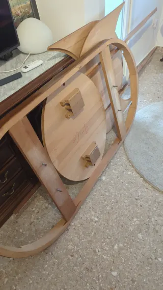 Mesa de comedor redonda extensible, fabricada en madera de haya natural. Comprada exactamente hace un año en muebles Lara, en perfectísimo estado. Precio nueva: 1200€