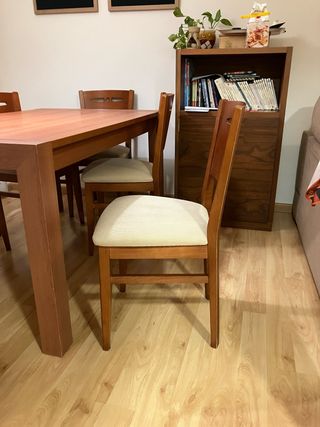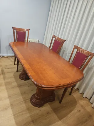 Preciosa mesa de comedor de madera por 75€ con cuatro sillas a juego gratis. Se encuentra en muy buen estado, lista para usar. - Medidas de la mesa: 150 cm de largo extensible a 200 cm. - Diseño clásico y elegante. - Perfecta para cuatro a seis comensales.