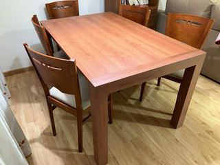 Conjunto de mesa de comedor con cuatro sillas. - Mesa con superficie de madera. - Sillas con estructura de madera y asientos tapizados. - Mesa extensible a 220aprox. - tiene una pata que se mueve un poco y hay que fijarla con cola sin problema aunque sostiene la mesa sin problemas