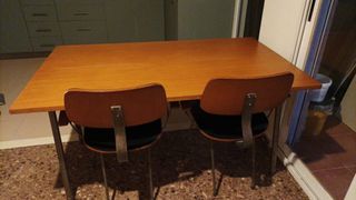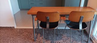 Conjunto de mesa libro extensible y dos sillas. - Mesa con tapa de madera y estructura metálica. - Sillas con asiento y respaldo de madera y detalles metálicos.