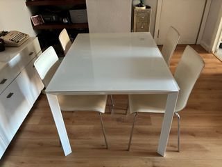 Elegante mesa de comedor con acabado lacado en blanco. Su diseño moderno se adapta a cualquier estilo de decoración. La mesa fue comprada en el corte inglés. Es extensible. - Tablero de madera en blanco lacado. - Patas de metal.