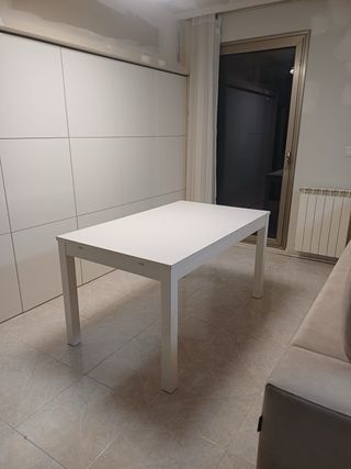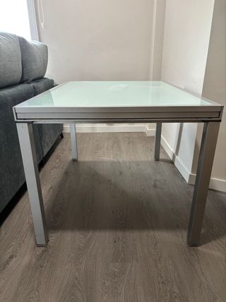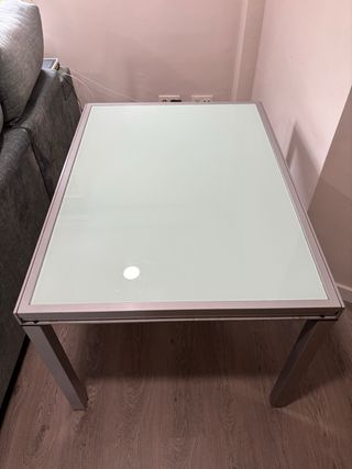 Elegante mesa de comedor con superficie de cristal y estructura de metal blanco en perfecto estado. Mide 1,70 x 1 cerrada, pudiendola abrir hasta 2,40. - Diseño moderno y minimalista. - Patas robustas para mayor estabilidad. - Acabado blanco en la estructura.