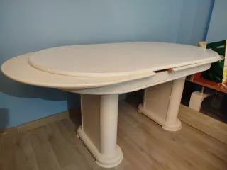 Mesa de comedor redonda lacada color blanco roto. Diámetro 110cm. Extensible a 135 y 160 cm. Marcas apareciables de cerca. Muebles de salón a juego en mi perfil.
