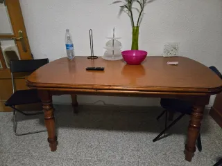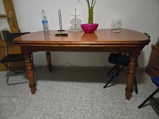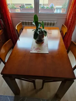 Elegante mesa extensible de comedor con un diseño moderno y funcional. De madera maciza. Da un toque cálido y sofisticado a cualquier espacio. - Realizada en madera. - Medidas: 90 cm ancho x 77 cm alto x 140 cm largo sin extender (226 cm extendida). - Diseño extensible para mayor versatilidad. - Patas robustas para mayor estabilidad. - Perfecta para cualquier salón. - La mesa tiene una pequeña rayadura debido al uso, que se muestra en una foto, pero en general está perfecta.