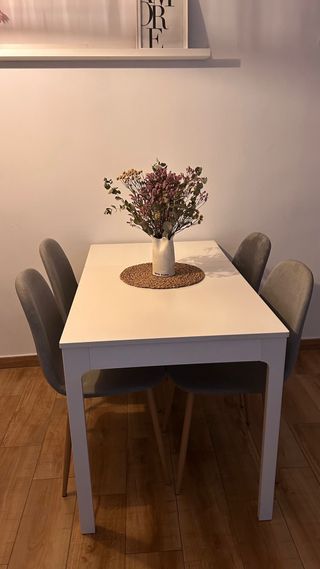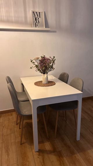 680*558*196 ☎️ Mesa de comedor blanca extensible moderna nordica. Gracias a su sistema extensible, pasa de 138 cm a 178 cm, permitiendo sentar cómodamente de 4 a 6 personas. Acabado moderno en color claro. 👉 Medidas: Largo: 138 a 178 cm Ancho: 80 cm Alto: 79 cm 👉 Precios: Mesa + sillas: 210€ Mesa sin sillas: 90 € Ideal como mesa de comedor, mesa extensible para salón, mesa moderna o mesa para cocina grande.