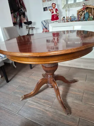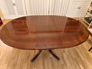 Elegante mesa de comedor de estilo clásico, perfecta para reuniones familiares o cenas especiales. Su diseño extensible la hace muy práctica. - Acabado en madera de alta calidad. - Diseño ovalado con detalles de marquetería. es extensible 40 cm más haciendo un total de 170
