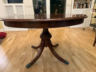 Mesa extensible con un bonito acabado que imita la madera. Se encuentra en buen estado. - Diseño ovalado. - Patas de madera tallada. largo 177 ancho 85 alto 77