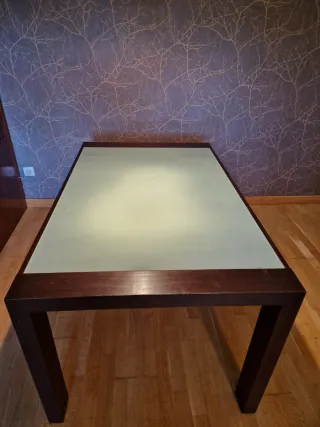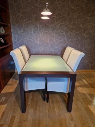 Conjunto de mesa de comedor con sobre de cristal al acido y estructura de madera, acompañado de cuatro sillas con fundas en color beige, se venden con funda ya que el estado de las sillas está muy deteriorado. Se vende por separado, la mesa nueva tenía un coste de 1.000 euros - Mesa extensible en dos tramos, cada tramo extiende la mesa en 39 cms. Medidas sin extensión 141x90 cms. - Sillas con fundas blancas. Ancho: 40 cms, fondo: 50 cms, alto: 105 cms. Precio mesa: 130€, sillas: 50€, mesa y sillas: 145€.