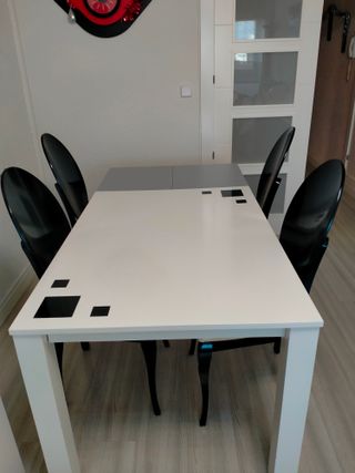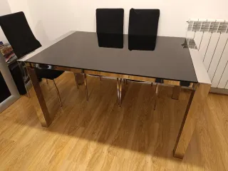 Conjunto de mesa de comedor con sobre de cristal y cuatro sillas. - Mesa extensible con estructura metálica. 235 € - Sillas con diseño moderno. (40€/unidad) Disponible también idéntico modelo, más pequeño, también extensible, como mesa de cocina,