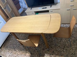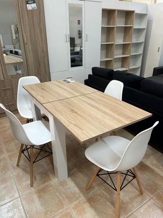 680*558*196 ☎️ Mesa: 75€ Mesa 4 sillas: 131€ Mesa de comedor nueva a estrenar, moderna y funcional, en acabado madera roble claro. Perfecta para hogares que necesitan ahorrar espacio sin renunciar a estilo. Es extensible, por lo que puedes usarla cerrada para el día a día o abrirla para recibir a invitados. Muy estable y de excelente calidad. 📏 Medidas: Largo: 67cm (cerrado) y 134 cm (abierto) Ancho: 67 cm Alto: 78 cm