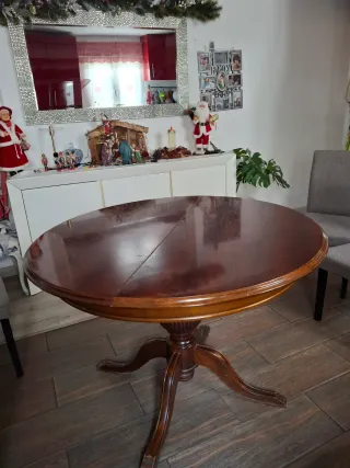 Mesa de comedor redonda con un diseño clásico y funcional. - Tablero extensible para mayor capacidad. - Base central de cuatro patas para estabilidad. - Es de 87cm de diámetro que se amlia a una mesa o alada de 120cm x 87cm - Tiene dos marcas de vaso que cambia el tono del barniz.