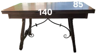 Elegante mesa con estructura de madera y detalles en forja. Cuenta con varios cajones para almacenamiento. - Diseño rústico y funcional. - Patas de madera robustas. - Tiradores metálicos en los cajones. - Barra de forja decorativa entre las patas.