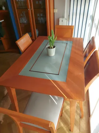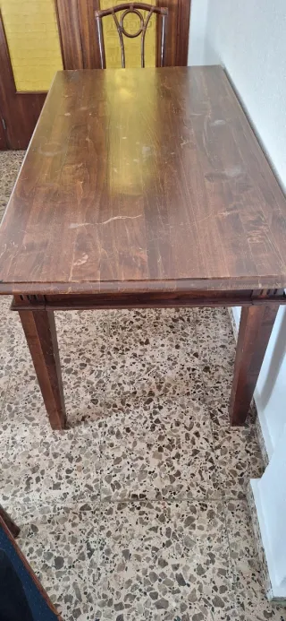 Mesa de comedor grande con 6 sillas incluidas. Medidas: 150 cm de largo (extensible por un lado) y 90 cm de ancho. Estructura sólida y muy estable. Ideal para familias o espacios amplios. ⚠️ Tiene algunos desperfectos estéticos del uso (se ven en fotos): pequeños golpes en esquinas y una silla con desgaste en la pata. No afecta a su uso. Se vende por cambio de mobiliario. 📍 Recogida en Mutxamel 🚚 No hago envíos Precio algo negociable. Urge venta.