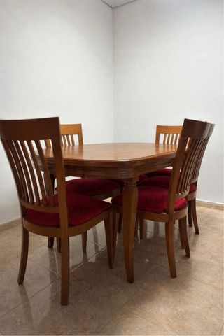 Conjunto de mesa de salón con cuatro sillas a juego. Ideal para comedor o sala de estar. - Mesa de salón grande. - Incluye 4 sillas. También puede ser por separado Cada silla 12€ y la mesa 60€ La mesa tiene 1,43 de largo y 75 cms de ancho Se puede agrandar La parte central se sube y al estirar los laterales, haces la mesa mas grande Las sillas tienen el tapizado prácticamente nuevo, el problema que tienen que los respaldos se despegaban de las culeras y yo no soy muy manitas para encolarlas bien por eso las doy tan baratas y porque quiero cambiar todo a algo mas pequeño Pero apenas se han usado