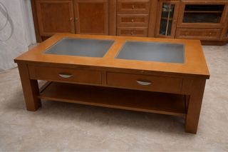 Mesa de madera con tapa de cristal y cuero