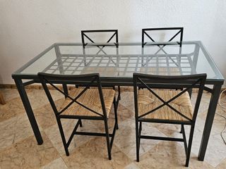 Mesa de comedor de cristal + 6 sillas – diseño moderno y muy resistente (oportunidad) ✨ Vendo conjunto de comedor compuesto por mesa grande de cristal templado con estructura metálica negra y 6 sillas a juego con asiento de fibra natural trenzada. Diseño moderno tipo industrial/elegante, muy estable y cómodo. Queda precioso en cualquier salón o comedor luminoso (como se ve en las fotos). 🪑 Incluye: ✔️ Mesa amplia de cristal grueso y resistente ✔️ 6 sillas robustas con respaldo metálico ✔️ Asientos cómodos de fibra natural (muy duraderos) ✔️ Todo en muy buen estado, bien cuidado 📐 Ideal para 6 personas cómodamente (incluso 8