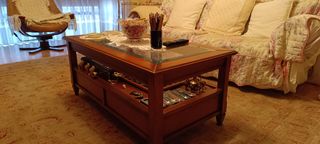 Mesa pequeña de salon de 90*50 cm elevable y con almacenaje. Con detalle de cristal en negro. Tiene puestas algunas tiras de protección y restos de pegamento. Se puede vender en conjunto con la mesa grande por 110€ el pack. Estan en perfecto uso, nos queremos deshacer de ellas por hacer más espacioso el salón