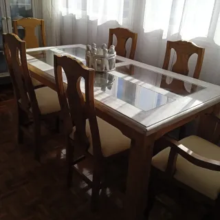 Vendo juego de comedor de madera de muy buena calidad con 6 sillas. Es extensible, una mesa amplia y elegante. Tiene 3 detalles de cristal decorativos en el centro que le dan un toque moderno. Está muy bien cuidada y en excelente estado, lista para usar. Las sillas son cómodas y resistentes, a juego con la mesa. Perfecta para familias o para quien quiera una mesa grande y sólida. Características: Mesa de madera robusta 6 sillas incluidas en perfecto estado Detalles de cristal en la superficie Diseño moderno y elegante Muy buen estado Se vende por cambio de mobiliario. Medidas: extendida 227cm Normal 145cm Cada lama para