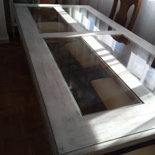 Mesa de comedor grande de estilo provenzal, con un diseño único. No me coge por espacio en mi nueva casa. 2x1.m Preciosa. Madera maciza. - Tablero de madera con detalles de cristal. - Acabado en tono marrón.