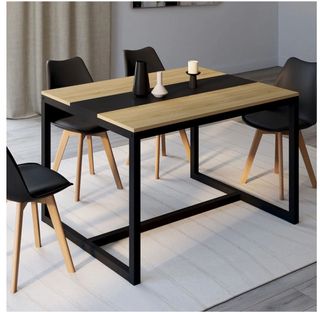 Mesa de comedor con un diseño moderno e industrial, combinando la calidez de la madera con la robustez del metal. - Tablero de madera con detalles en madera negra. - Patas metálicas negras. Apta para 6 personas. La compre y no fue para el ambiente, ni siquiera he llegado a montarla. Esta en su embalaje original.