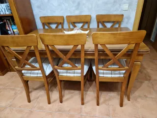 Mesa de comedor con un diseño clásico y elegante, perfecta para cualquier hogar. - Mecanismo de extensión para mayor capacidad. - Acabado en tonos madera natural. - 6 sillas. Cada silla 20€