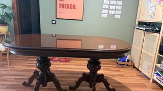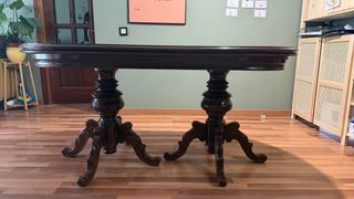 Urgente vender! Mesa de comedor redonda con posibilidad de extensión. - Diseño clásico y funcional. - Patas robustas con detalles metálicos en los extremos.