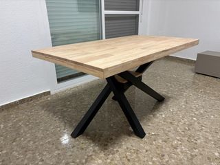Mesa de salón con diseño moderno y estrafalario. Precio negociable. - Tablero de madera maciza. - Patas metálicas en forma de X.