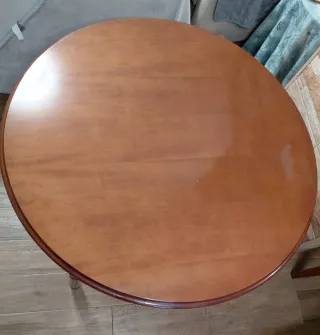 Elegante mesa de comedor con un diseño clásico y robusto. Tiene la tapa superior deteriorada.