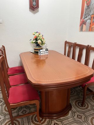 Conjunto de mesa de comedor ovalada y seis sillas a juego, fabricadas en madera maciza en perfecto estado. Diseño clásico y de gran robustez y estabilidad. Sus medidas son 160x91x75 cm y se puede abrir hasta 2 m de largo. - Mesa de comedor clásica de madera maciza. - Seis sillas de madera con estampado clásico a juego. Se incluye las fundas de cada una que protegen el estampado. No se realizan envíos. No bizum. La mesa se ha de desmontar para poder sacarla del piso y se necesitan 2 personas para bajarla.