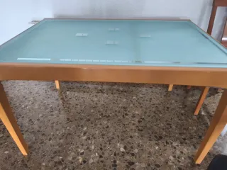 Mesa de madera con tapa de cristal