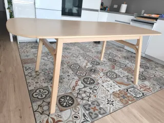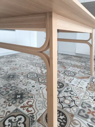 Conjunto de mesa de comedor con cuatro sillas. - Mesa de madera con acabado natural. - Sillas con asiento tapizado. La mesa se abre y caben hasta 8 comensales Medidas: Largo:135 cm (mesa cerrada) Alto: 75cm Ancho: 85 Largo: 205 (mesa abierta) 📍 Recogida en persona. Si te interesa o quieres más fotos, escríbeme.