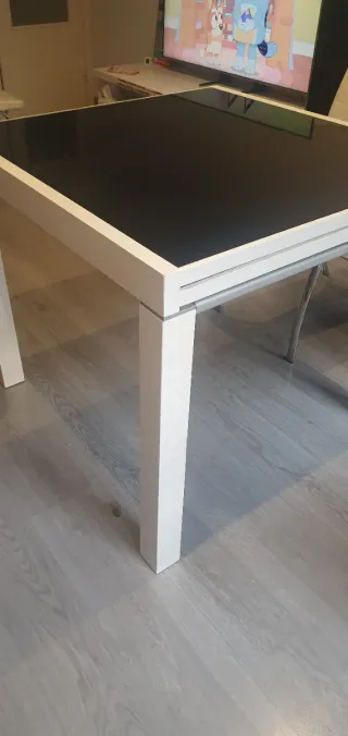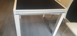 Mesa de comedor extensible, tenemos dos unidades una en color madera y patas blancas y la otra totalmente blanca. En las fotos la de color madera esta extendida y la blanca esta en tamaño normal. medidas: 140x90 medidas extendida: 190x90 130 cada una