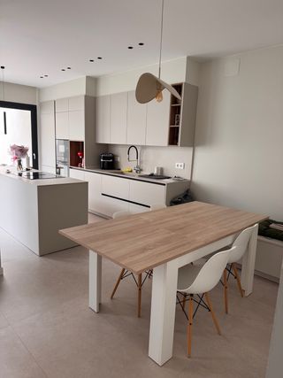 680*558*196☎️ 🍽️ Mesa de comedor moderna blanca – ideal para 6 persona Se vende mesa de comedor de estilo moderno en color blanco, perfecta para cocina o comedor. Su diseño limpio y minimalista combina fácilmente con cualquier tipo de decoración y aporta luminosidad al espacio. La mesa es robusta, amplia y muy práctica 📏Medidas de la mesa: Largo: 140 cm Ancho: 80 cm Alto: 75 cm 💰 Precios: Mesa sola 70€ Mesa + 6 sillas: 154€ Las sillas tienen asiento negro con patas de madera estilo nórdico, muy modernas.