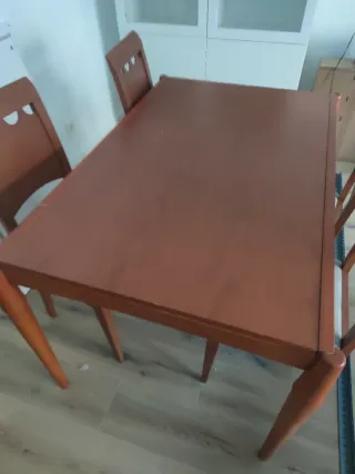 Conjunto de mesa de comedor extensible con cuatro sillas a juego. - Mesa de madera color marrón. - Sillas de madera con respaldo de varillas. Mesa abierta 1,60 m. Se entrega en Valladolid capital No envío. Mejor verlo, buena madera. La mesa en la tapa tiene alguna marca.